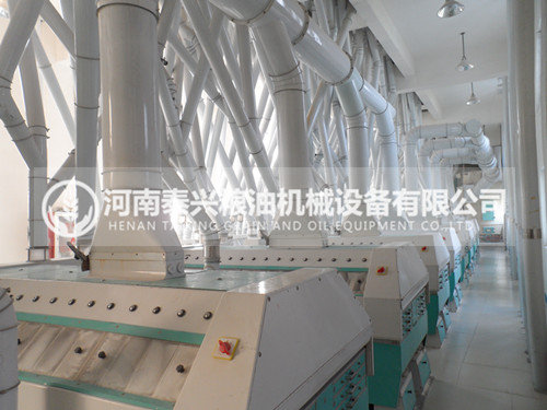 面粉機組清理流程采用——四篩兩打,兩去石,一次精選,三次磁選,兩次著水的完善工藝。面粉設備制粉流程采用強調分級的中長粉路出粉法,主要工藝為4-5皮,6-8心,1-2渣,1-2尾,3-6清粉,3-4打麩。